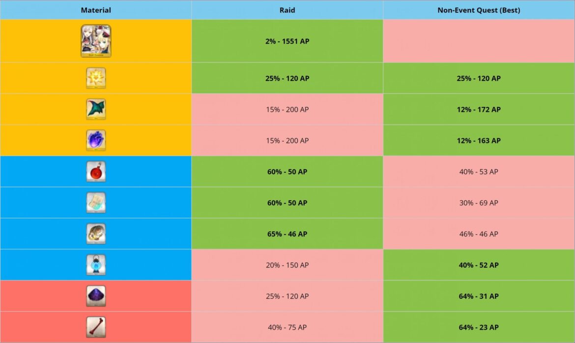 Farming this Raid is highly recommended, the individual material drop rates for this Raid is comparable or even superior to that of singularity free quest, all obtainable from a single 1-2 turn battle for just 30 AP.