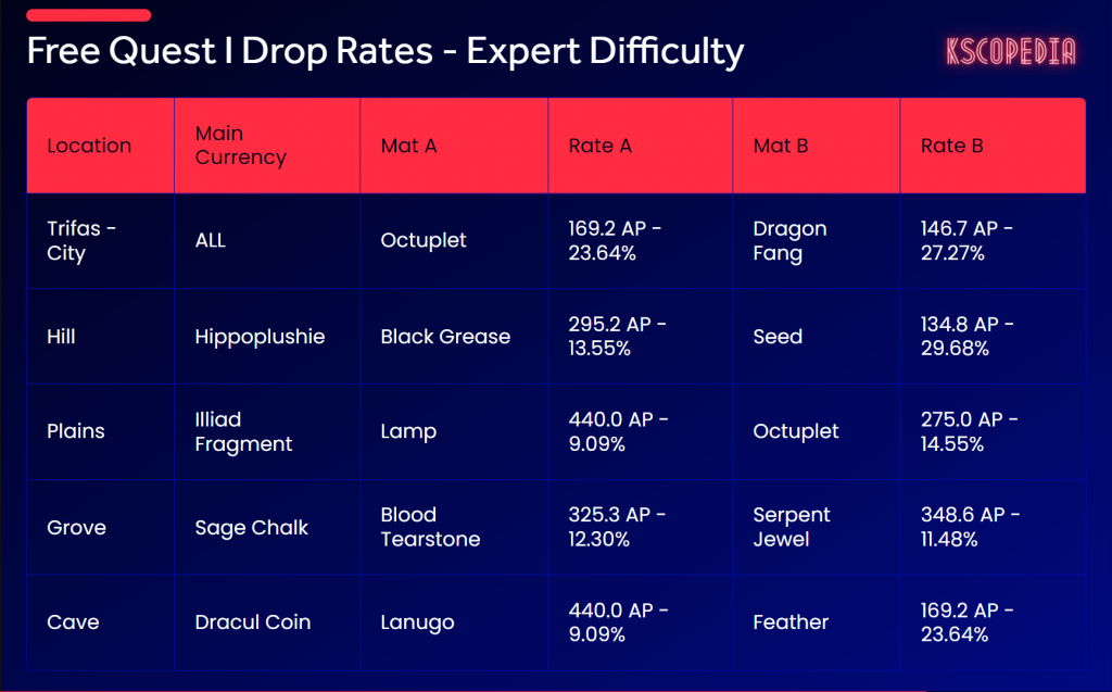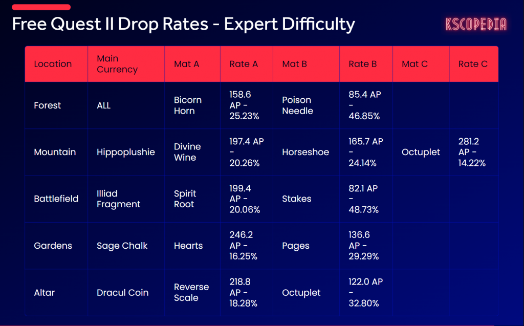 - While individually each item drop rate is inferior to farming singularity free quests, the fact that you get multiple different materials at the same time on top of it being party of your event progression makes it a good bargain for the AP.