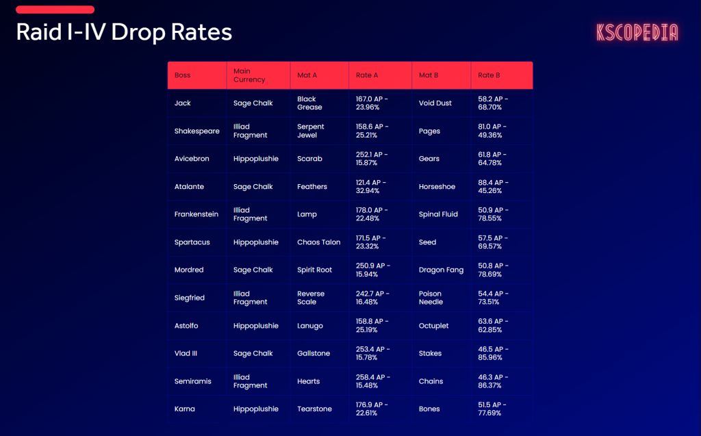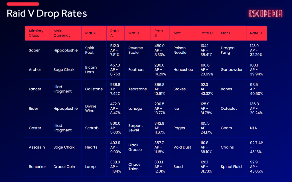 - Raid I-IV have much better drops for individual materials while Raid V has half the rates due to the 50/50 Chance of which servant shows up.