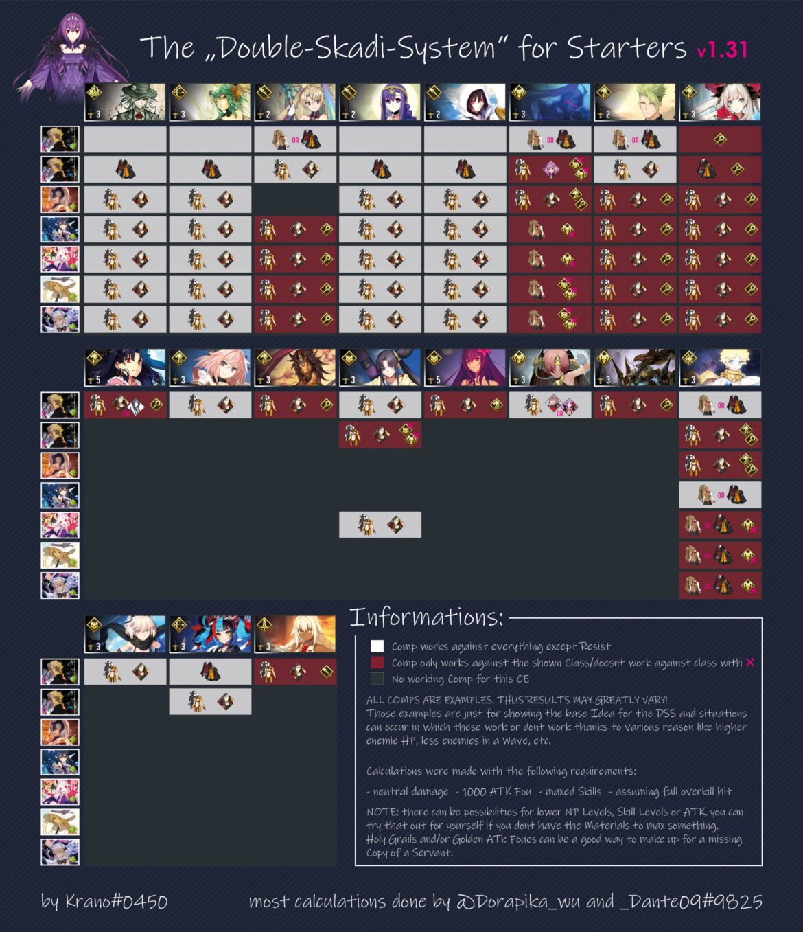 In battle, Start off with activating their 1st and 3rd Skill paired with the Quick Buffs from Double Skadi and you're pretty much good to go.